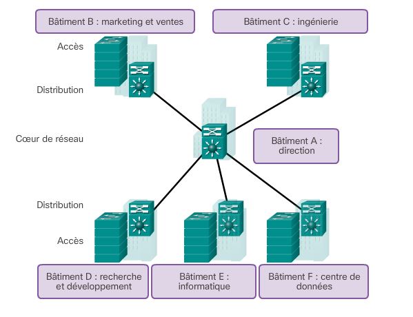 Comme vous pouvez le voir, il y a trois couches sur ce réseau. La couche Accès, la couche Distribution et la couche Coeur du Réseau.