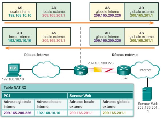 - Adresse locale interne : L'adresse source vu du réseau interne : 192.168.10.10 : PC1 => @locale interne de PC1
