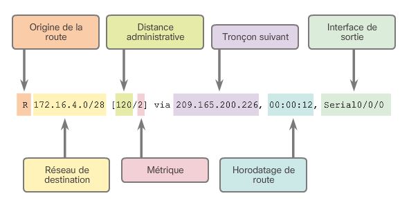 La métrique indique le "cout" de la route et la distance administrative "la fiabilité de l'origine de la route". L'horodatage indique la dernière fois que la route a été détéctée. Le reste est logique !
