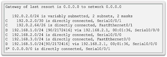 - Route de niveau 1 : Sur l'exemple, la route "directly connected" qui commence par 0.0.0.0/0 est une route de niveau 1 tout à fait normale, comme celle située juste au-dessus d'elle par exemple.