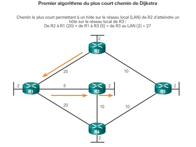 Les routeurs utilisant un protocole à état de liens se disent "bonjour" via le protocole Hello. Cela permet de détecter ses voisins :D Les routeurs vont ensuite créer des LSP (Link-State Packet) qui contiennent le coût, le style de connexion et le réseau de chaque lien connecté directement au routeur en question. Il va ensuite les diffuser aux autres routeurs pour qu'ils puissent les stocker dans leur base de données. Lorsqu'un routeur reçoit un paquet LSP, il le transfère à toutes les autres interfaces (sauf à celle qui l'a reçu, évidemment :) Une fois la base de données remplie, le routeur peut l'utiliser pour calculer le chemin optimal avec l'algorithme SPF (Short Path First)