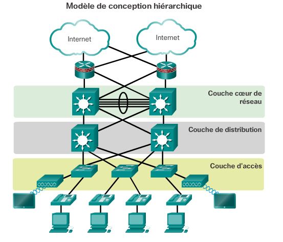 Ici, vous pouvez voir les trois couches. Chaque couche a un but précis ! Les utilisateurs sont connectés grâce à la couche d'accès, le trafic est transféré entre tous les locaux grâce à la couche de distribution et enfin, le réseau fédérateur haut débit est dispersé entre les réseaux grâce à la couche coeur de réseaux.