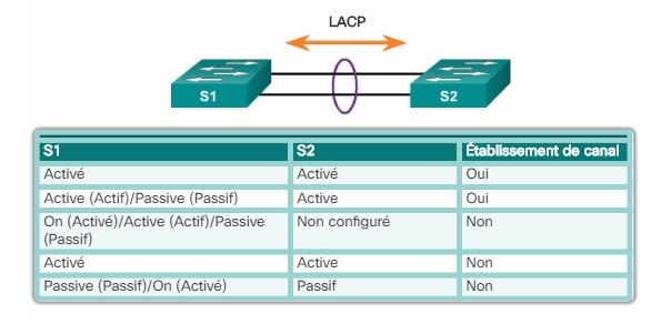 LACP : Ce protocole n'est pas propriétaire Cisco ! Il fait partie de la spécification IEEE 802.3ad permettant de groupir plusieurs ports physiques afin d'en former un seul, pour les contrôler tous... Bref il fait un peu comme PAgP quoi. Il a lui aussi 3 modes :