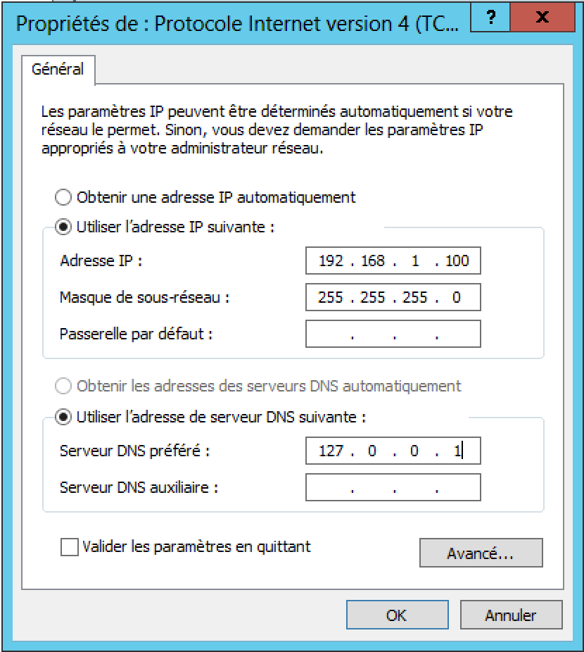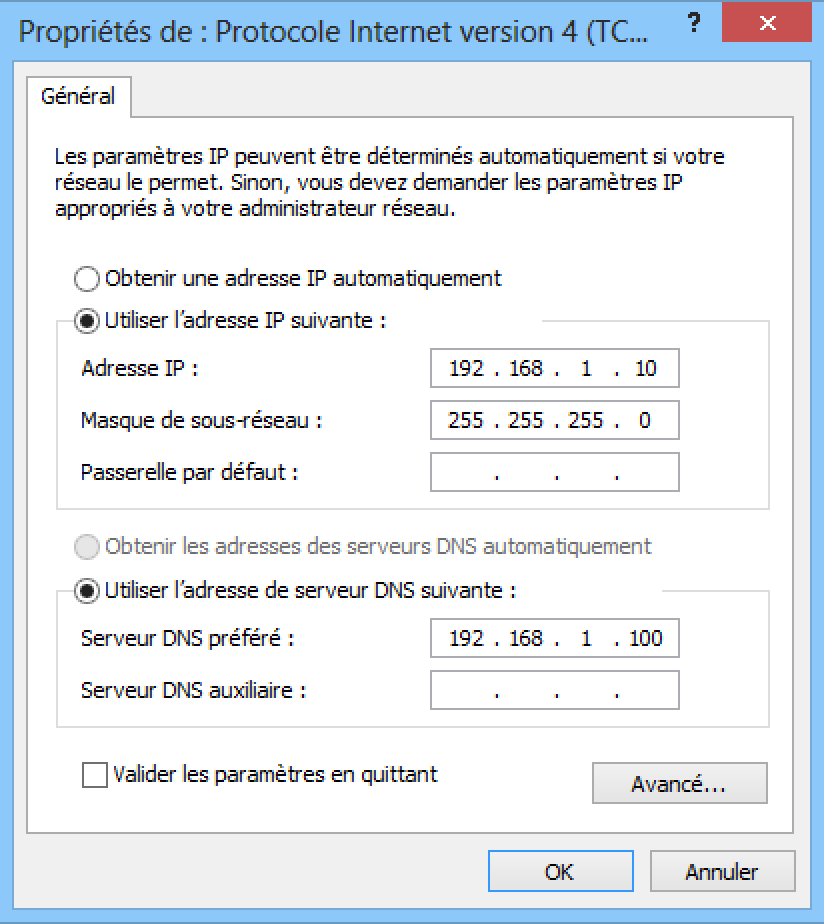 La première étape consiste à changer le réseau du serveur. Il faut lui attribuer une adresse IP fixe comme ci-dessous.