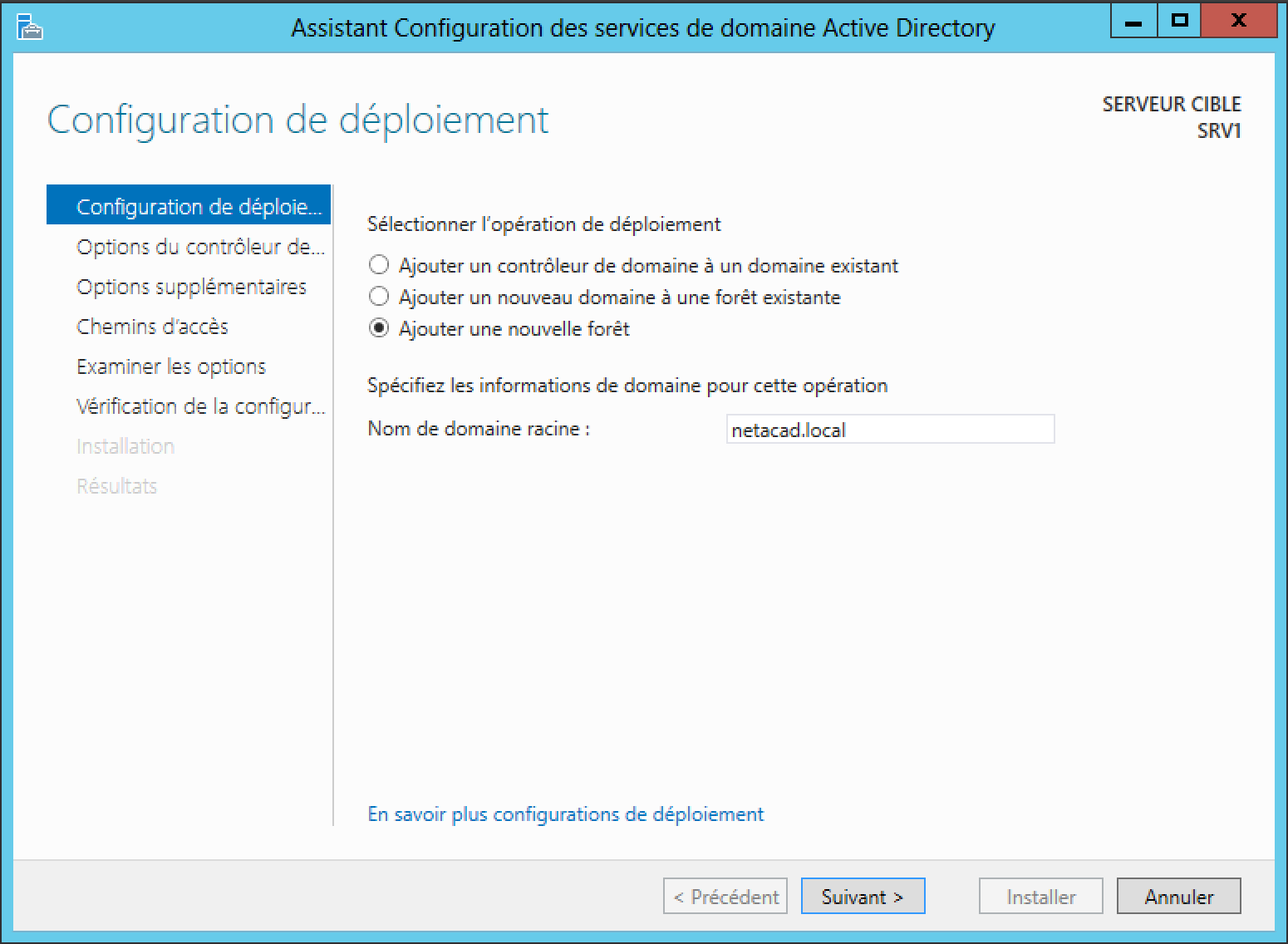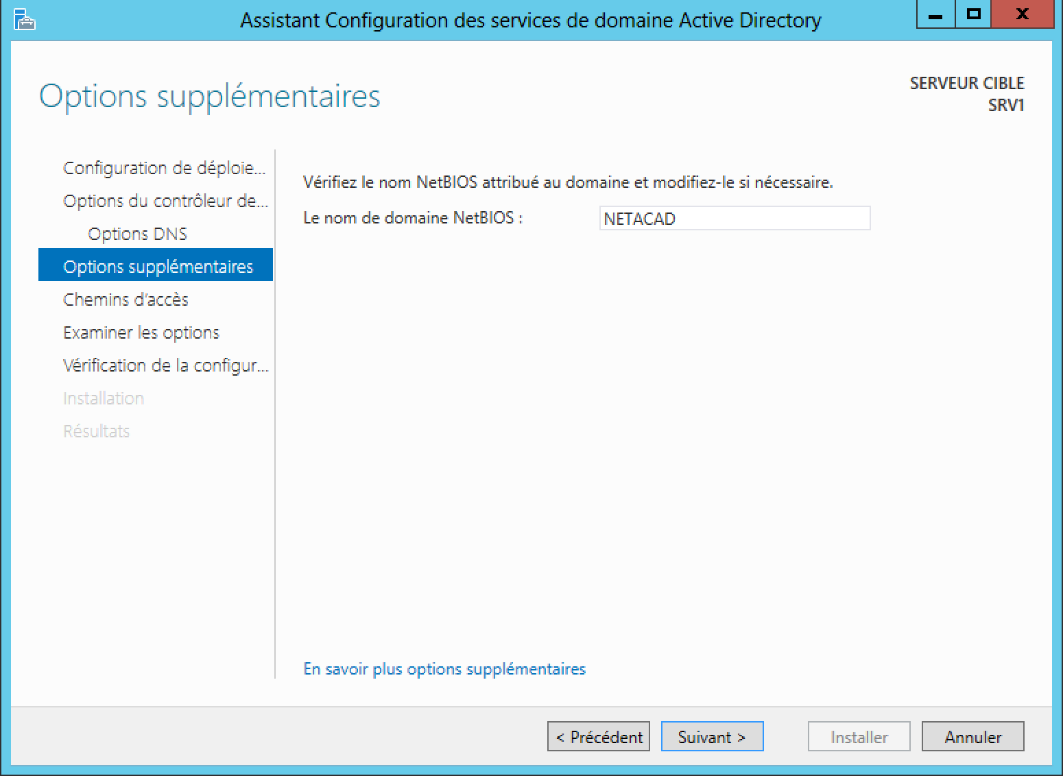 Entrez ensuite la valeur NETACAD pour le Netbios dans les options supplémentaires. Puis lancez l’installation.
