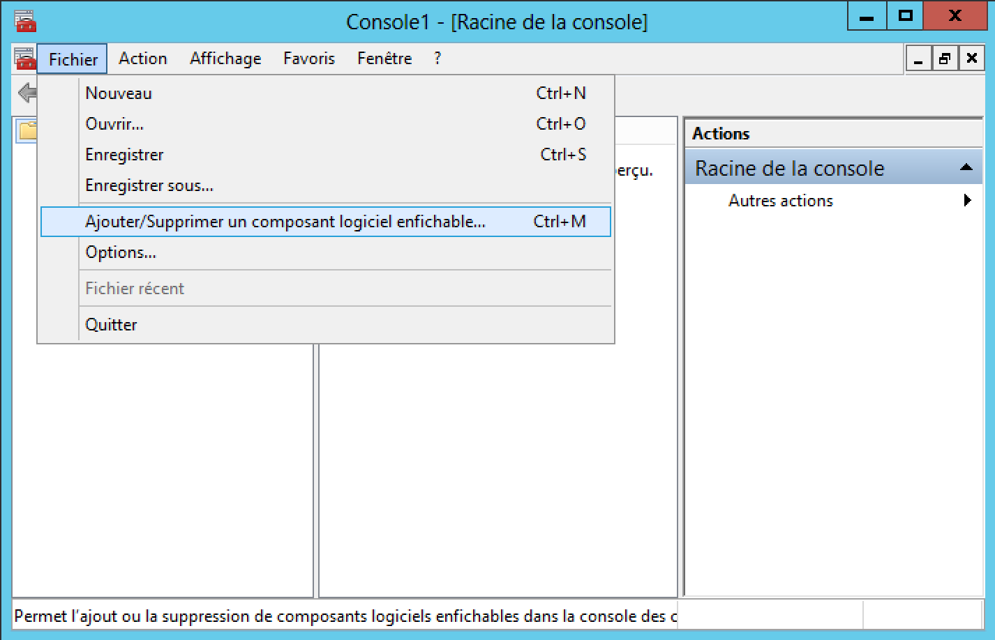 Servez-vous de la tabulation pour bien sélectionner les fichiers (sinon ça bug…) Ensuite, tapez la commande « MMC ». Cette commande va vous ouvrir une fenêtre sur laquelle vous pourrez cliquer (en haut à gauche) sur « Fichier » puis « Ajouter/Supprimer un composant logiciel enfichable… »