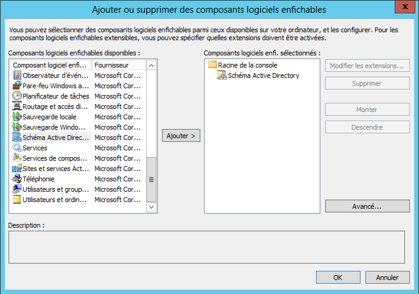 Et ajoutez dans les « Composants logiciels enfichables sélectionnés » : « Schéma Active Directory » et appuyez sur OK.