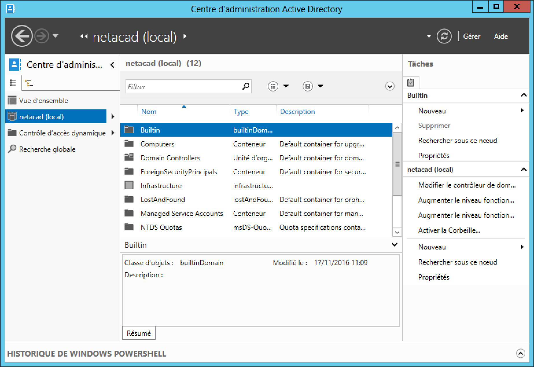 Ici, on retrouve l’architecture par défaut de notre nouveau domaine AD !