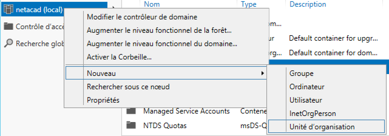 Nous allons maintenant ajouter une OU. Pour cela, faites un clic droit sur le nom de votre domaine, allez dans « Nouveau » => « Unité d’Organisation ».
