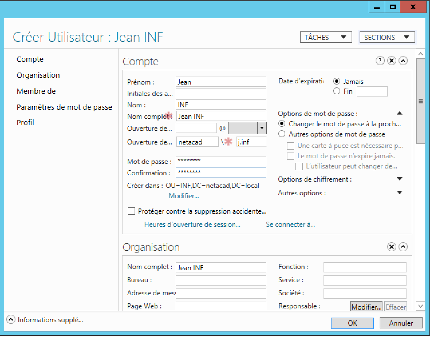 Il y a juste le nom à mettre, nous n’avons pas besoin de plus. Ensuite, nous allons créer des utilisateurs. Pour cela, allez dans l’OU en question et hop ! Clic droit, nouveau, utilisateur !