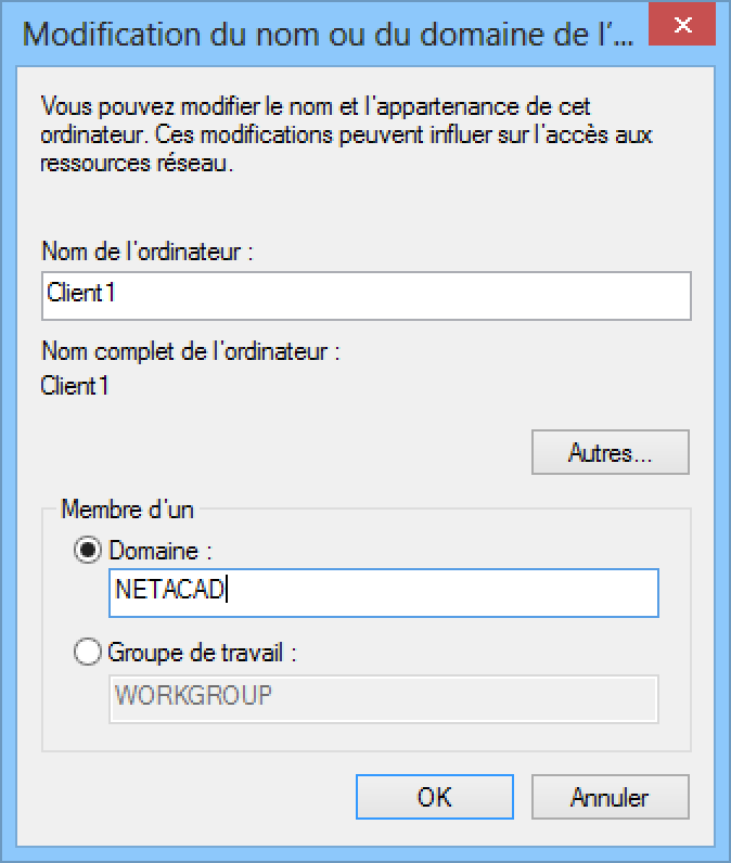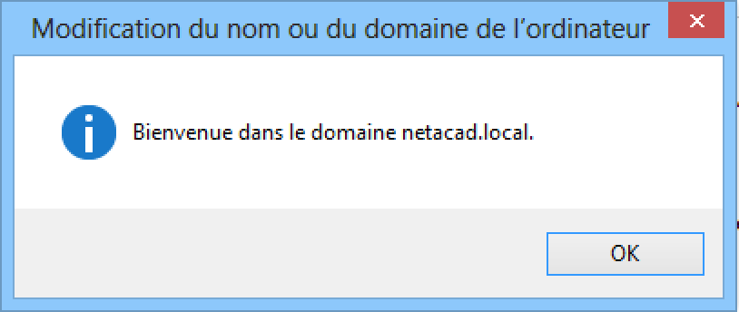 Puis « Modifier les paramètres » cliquez sur « Modifier » dans la nouvelle petite fenêtre qui s’ouvre et entrez un nouveau nom (si vous le voulez) pour votre ordinateur Windows 8 et cochez « Membre d’un domaine » et écrivez le nom du domaine. Le domaine vous demandera les accès administrateur pour y ajouter ce PC ! Une fois les accès entrés, un message vous souhaitera la bienvenue chez NETACAD :)