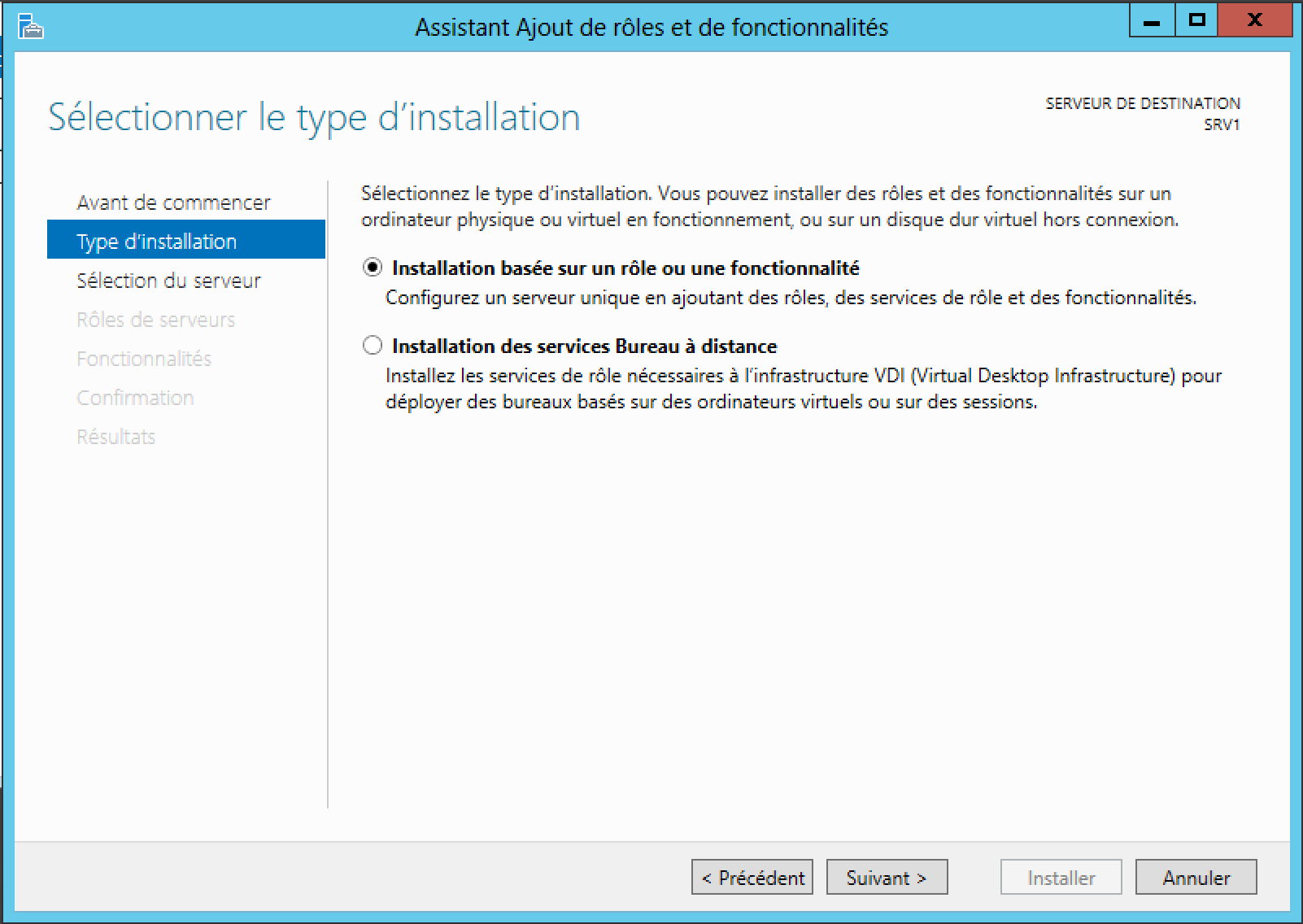 Ensuite, pour installer les rôles liés à l’Active Directory, il faut ouvrir le gestionnaire des serveurs et cliquer sur « Ajouter des rôles et des fonctionnalités ». Ignorez la page par défaut en cliquant sur suivant puis choisissez « Installation Basée sur un rôle ou une fonctionnalité ».