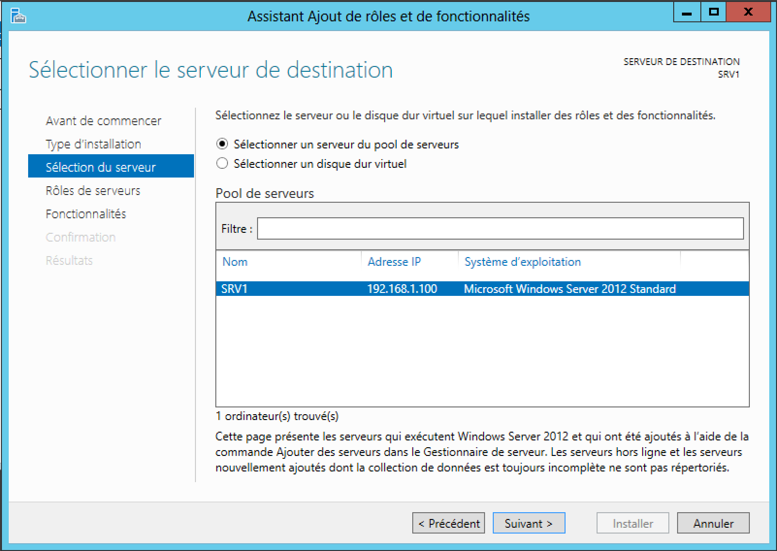 Vous pouvez ensuite sélectionner un pool (et non poule) de serveurs et choisissez le SRV1 (puisqu’il est le seul sur le réseau… pas le choix !).