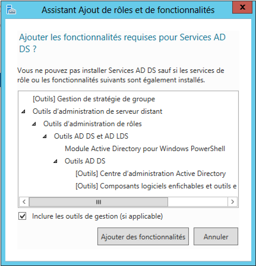 Une fenêtre qui montre tous les rôles liés au service AD DS va s’ouvrir, laissez tout par défaut et appuyez sur « suivant ».