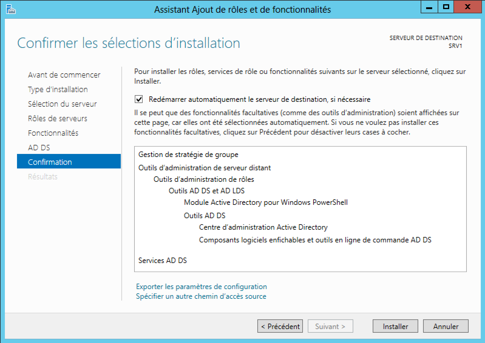 Ignorez la fenêtre des fonctionnalités, ne cochez rien et faites « suivant ». Après cette page ‘inutile’ pour nous, une page de résumé va apparaître, vérifiez votre configuration et appuyez sur « suivant ». Pour terminer, une fenêtre de confirmation va pop à son tour ! Cochez « Redémarrer automatiquement le serveur de destination, si nécessaire » Puis, cliquez sur « Installer ».