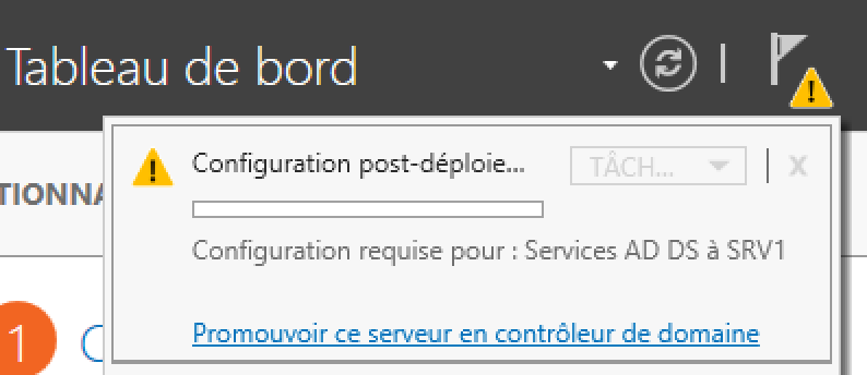 Après avoir installé les rôles, on va devoir promouvoir notre petit serveur en contrôleur de domaine ! Pour cela, cliquez sur le petit drapeau en haut à droite du gestionnaire des serveurs puis sur « Promouvoir ce serveur en contrôleur de domaine » !