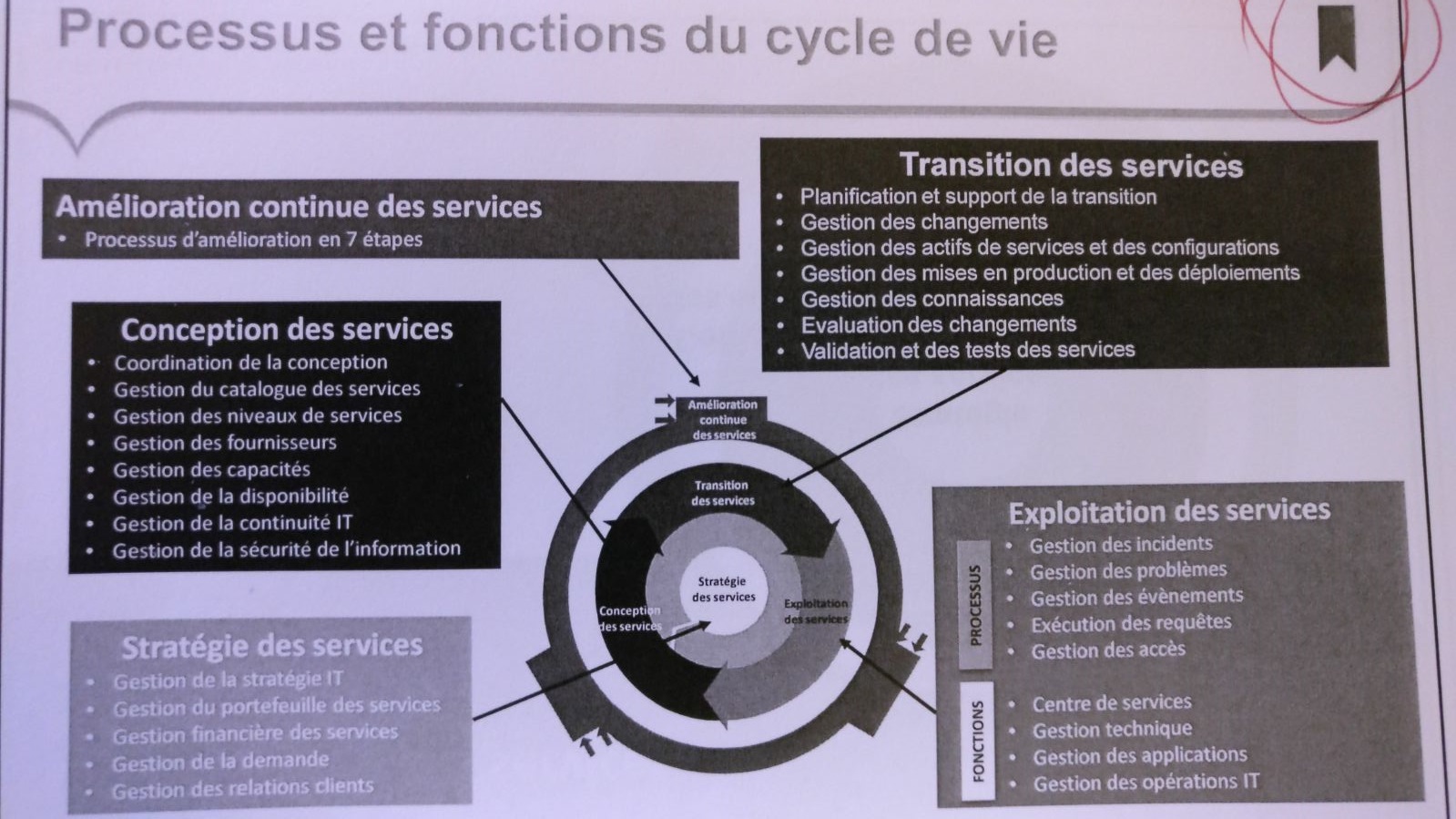 Voici le résumé du cycle de vie. On se servira de ce schéma comme "plan" pour la suite du cours. Nous allons commencer par le cadre "Stratégie des Services".