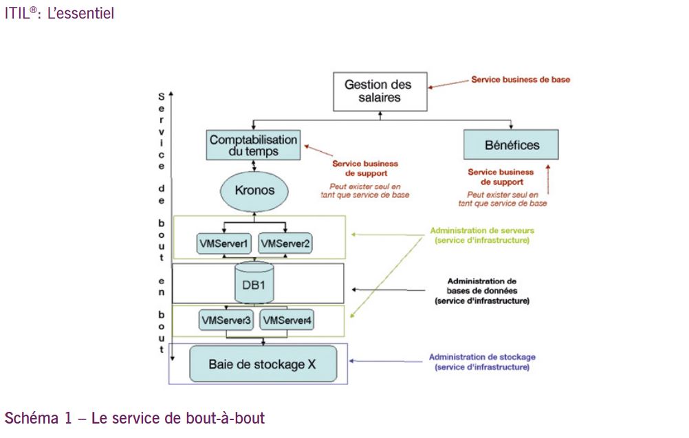 La gestion des salaires. Ce service peut en appeler d'autres : Pour gérer les salaires il faut faire appel à La comptabilisation du temps ou encore L'administration des avantages sociaux afin de calculer correctement les informations nécessaires au calcul de la rémunération d'un employé sur une période donnée. Seulement, pour que tous ces services fonctionnent, il y a quelques services dits d'infrastructure incontournables. Les services d'infrastructure travaillent en arrière plan, dans l'ombre, et n'intéragissent pas directement avec les services business. On peut y trouver par exemple : L'administration des serveurs, L'administration de bases de données, ou encore L'administration du stockage. Tous ces services doivent exister et fonctionner pour que les services business puissent être opérationnels. Comme vous pouvez le voir sur ce Schéma numéro 1.